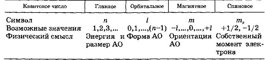 Таким образом, для полной характеристики состояния электрона в атоме необходимы четыре квантовых числа. Первые три из них определяют распределение его плотности в пространстве, а четвертое - его спин. Знание смысла и возможных значений квантовых чисел имеет исключительное значение для химика, поэтому ниже мы приводим краткую сводку важнейших сведений такого рода.