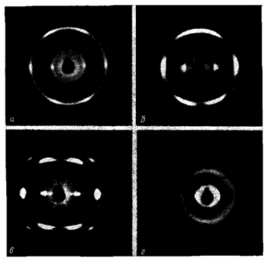 Рис.1. Фоторентгенограммы различных структурных форм ПФ: а - а-фаза (образец 3); б - (-фаза (образец 4); в - (-фаза (образец 8); г - мезофаза, 373 К