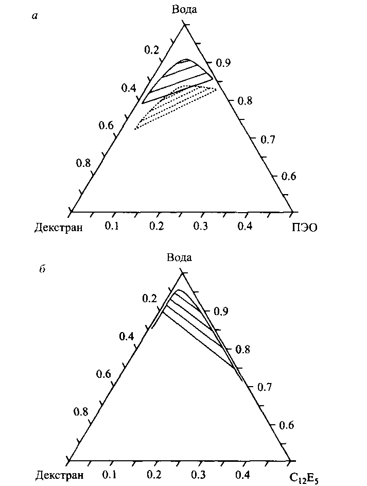 Рис. 3. Фазовые диаграммы (а) водных смесей декстрана (молекулярная масса 23000) и поли (этиленгликоля) (молекулярная масса 2300 (пунктирные линии) и 18000 (сплошные линии)) в сравнении с диаграмами (б) смеси декстрана (молекулярная масса 40000) и С12Е5. Выше кривых расположены зоны смешиваемости, под кривыми системы разделяются на две жидкие фазы (два раствора), (a)