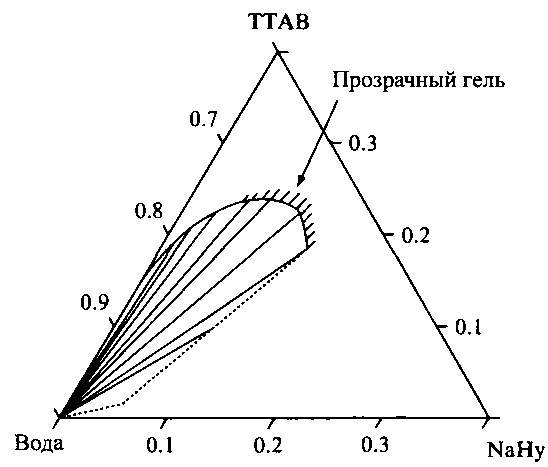 Рис. 7. Смесь ионного ПАВ и противоположно заряженного полиэлектролита обычно характеризуется ассоциативным типом фазового разделения. Приведена фазовая диаграмма смеси бромида тетрадецилтриметиламмония с гиалуронатом натрия в воде