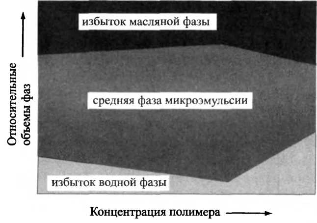 Рис. 12. Распределение полимеров с большой молекулярной массой в нижней водной фазе трехфазной микроэмульсии приводит к дестабилизации и уменьшению объема микроэмульсионной фазы. Представлены относительные объемы фаз в зависимости от концентрации полимера