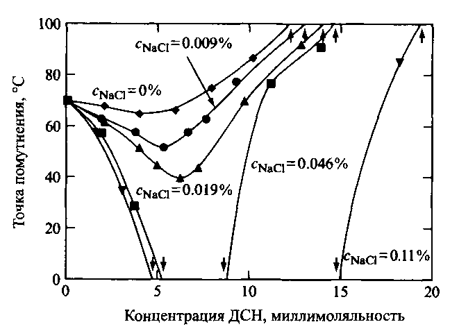 Рис. 5. Введение ионного ПАВ в раствор (0.9 мас.%) полимера, обладающего точкой помутнения (гидроксиэтилэтилцеллюлоза) приводит к повышению точки помутнения в отсутствие электролита и к понижению точки помутнения в присутствии небольших концентраций электролита. Влияние на точку помутнения добавок ДСН показано в отсутствии электролита и в присутствии разных количеств NaCl; сверху вниз кривые соответствуют 0, 0.01, 0.02, 0.04 и 0.10 мас.% соли