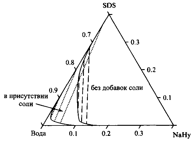 Степень фазового разделения системы, представленной на рис. 7, сильно возрастает с увеличением длины алкильной цепи в молекулах ПАВ и молекулярной массы полимера. Введением электролита можно ингибировать фазовое разделение, но при повышении концентрации электролита фазовое разделение происходит вновь, но уже по другому механизму (рис. 8). Данное явление аналогично наблюдаемому в смесях противоположно заряженных полимеров, его легче объяснить на основе представлений о несовместимости полимеров и электростатических эффектов. Концентрация противоионов очень высока, поэтому в отличие от систем с незаряженными полимерами, фазовое разделение системы, содержащей полиэлектролит, когда полиэлектролит концентрируется в одной из жидких фаз, ведет к пространственному ограничению противоионов и, как следствие, к очень сильному уменьшению энтропии. Именно поэтому полиэлектролиты намного лучше растворяются в воде, чем незаряженные полимеры. При высоких концентрациях электролита указанное изменение энтропии компенсируется, и фазовое разделение протекает по механизму, характерному для незаряженных полимеров. На рис. 8 представлена типичная сегрегативная система, что видно из фазовой диаграммы при высоких концентрациях электролита.