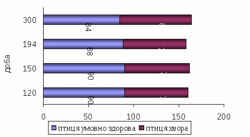 Зниження яйценосності на 20 % почали реєструвати у курей – молодок із кліничними ознаками, віком 120 діб. Відновлення яйценосності відбулося не повністю ще до 300 добового віку.