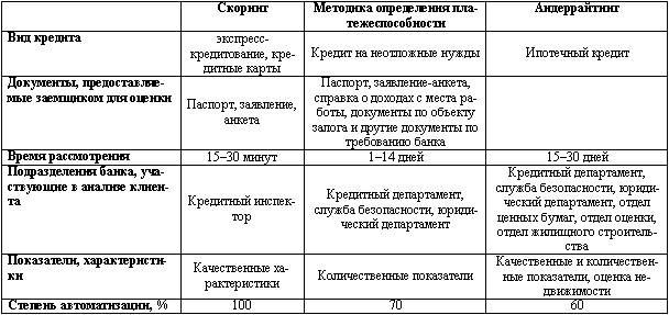 Приведенные выше методики отражают в основном теоретические разработки. Систематизация существующих теоретических и практических исследований отечественных и зарубежных авторов дают основания сделать вывод о том что, методики, применяемые в различных банках, имеют общий методический стержень, но в Сбербанке России более детальные и глубокие подходы к количественному и качественному анализу рисков. Использование упрощенных методик ускоряет процедуру оформления и выдачи кредита, что является привлекательным для клиента, при прочих равных условиях (максимальные лимиты ссудной задолженности, процентные ставки, формы обеспечения ссуды), однако при этом возрастает риск не возврата ссуды.