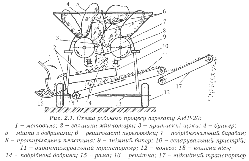 Робочий процес. Затарені або незатарені злежані мінеральні добрива навантажувачем ПКУ-0,8 завантажуються в бункер 4. Живильний механізм здійснює коливальний рух і подає мінеральні добрива до подрібнювального пристрою, що складається з двох барабанів 7, які обертаються назустріч один одному, і підпружинених протирізальних пластин 8. У подрібнювальному пристрої грудки мінеральних добрив і мішкотара подрібнюються.