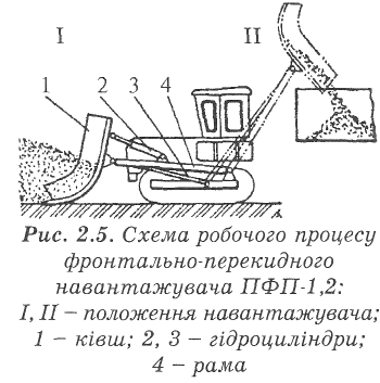 Фронтально-перекидний навантажувач ПФП-1,2 (рис. 2.5) обладнаний ковшем 1, підвішеним на П-подібній рамі 4. Для заповнення ківш опускають на землю і рухаються вперед (положення І), Потім його повертають гідроциліндром 2, піднімають гідроциліндром 3 (положення II) і вивантажують добрива в кузов транспортних засобів або розкидачів. Вантажопідйомність навантажувача - 1,5 т. Начіплюють його на трактор ДТ-75В. Продуктивність - до 125 т/год.
