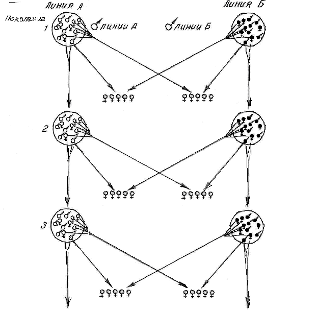 Комсток с сотрудниками (1959) предложили модификацию этого метода, которая должна сделать его применимым и в животноводстве, а именно реципрокную повторную селекцию на эффект гетерозиса. Животные двух гетерозиготных популяций, А и Б, испытываются в скрещивании с другой линией. Мужские и женские особи линии А, показавшие наилучшие результаты при скрещивании с линией Б, спариваются между собой в целях размножения линии А. Подобным образом спаривают между собой тех мужских и женских особей линии Б, которые показали наилучшие результаты при скрещивании с линией А. Это повторяется от поколения к поколению до получения оптимального эффекта сочетаемости. На рисунке 1 схематически представлен код этого процесса. Как только достигается оптимальный эффект сочетаемости, можно применять случайное спаривание в каждой из этих линий для сохранения необходимой численности животных; в то же время для получения пользовательных животных производится в возможно большем масштабе скрещивание этих линий.
