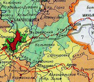 Рис 1. Иглинский район с прилегающими территориями (Атлас РБ): Иглинский район. 2 Нуримановский район. 3 Благовещенский район. 4 Кармаскалинский район. 5 Архангельский район. 6 Уфимский район. 7 Челябинская область