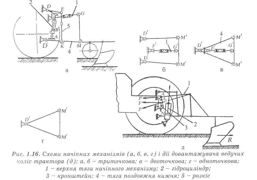 При агрегатуванні начіпних плугів з тракторами класу 3 начіпний механізм трактора налагоджують на двоточкову схему (рис. 1.16, в). У цьому випадку передні кінці обох нижніх поздовжніх тяг закріплюють в одній точці внизу на поперечній осі механізму.