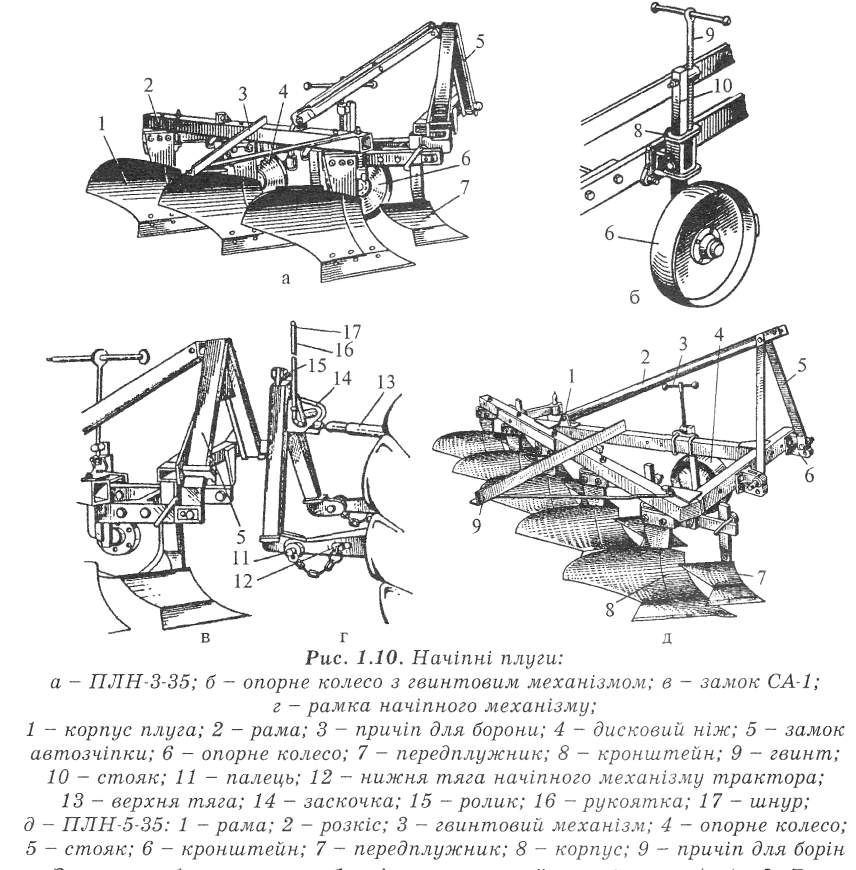 Він складається з п'яти корпусів 8 (рис. 1.10, д), п'яти передплужників 7, дискового ножа, опорного колеса 4 з гвинтовим механізмом 3, рами 1, начіпного пристрою (підвіски) для з'єднання з трактором, причіпного пристрою для борін 9. До начіпного пристрою плуга відноситься розкіс 2, стояки 5 і кронштейни 6 з пальцями.