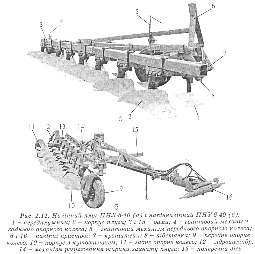 Плуг начіпний ПНЛ-8-40 призначений для оранки ґрунтів з питомим опором до 0,09 МПа. Агрегатують із тракторами класу 5. На рамі 3 плуга (рис. 1.11, а) встановлено: вісім корпусів 2, вісім передплужників 1, дисковий ніж, переднє та заднє опорні колеса і начіпний пристрій 6.