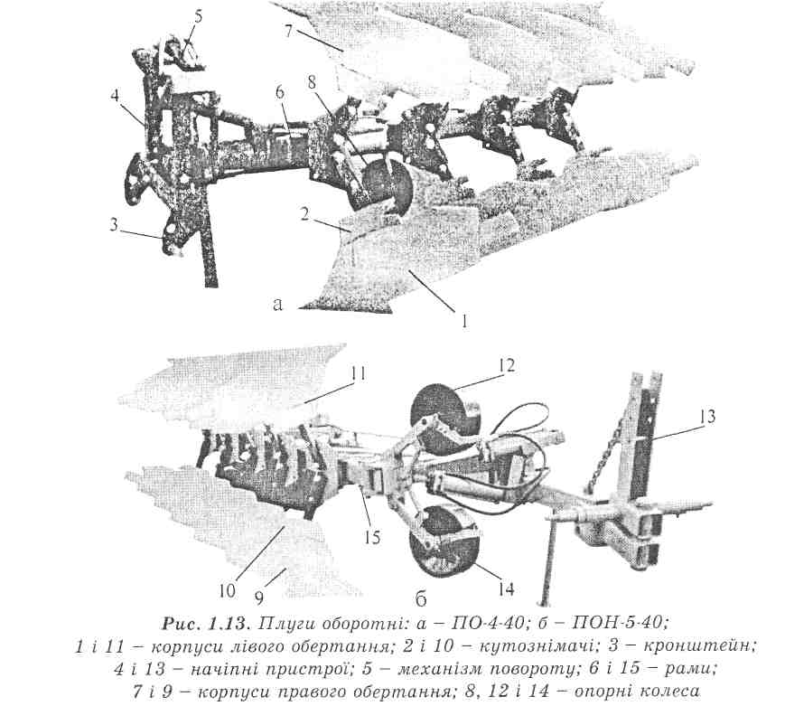 Плуг оборотний ПО-4-40 з регульованою шириною захвату начіпний. Він складається з чотирьох корпусів правого і чотирьох корпусів лівого обертання скиби (рис. 1.13, а), рами 6, опорного колеса 8, начіпного пристрою 4 і механізму повороту. Плуг має симетричну раму, яку за допомогою гідрофікованого механізму можна повертати на 180°.