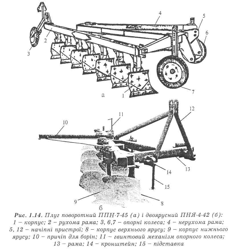 Плуг поворотний ППН-7-45 начіпний, складається з основної 4 і поворотної 2 рами (рис. 1.14, а), семи корпусів 1, двох передніх й одного заднього коліс, начіпного пристрою, гідроциліндра повороту рами і маслопроводів.