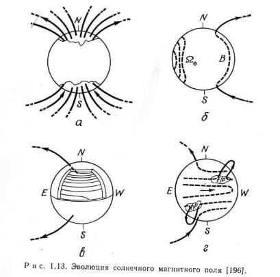 радиальная компонента направлена либо наружу, либо внутрь (рис.3). Эта секторная структура вращается вместе с Солнцем. По данным наблюдений межпланетных полей (с помощью ракет) период вращения Солнца может быть подразделён на несколько субпериодов, каждый продолжительностью в несколько суток, в течение которых радиальная компонента направлена преимущественно наружу или внутрь. Такая последовательность субпериодов может наблюдаться в продолжении нескольких оборотов Солнца, свидетельствуя о высокой степени стабильности секторной структуры. СВ движется наружу так, как если бы магнитного поля не было. В системе отсчёта, жёстко связанной с Солнцем, магнитные силовые линии параллельны или антипараллельны направлению СВ.
