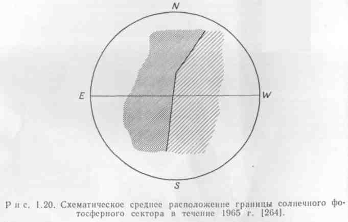 Рис.5 Схематическое среднее расположение границы солнечного фотосферного сектора в течении 1965г.