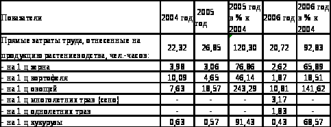 Как видно из таблицы 11 наблюдается снижение затрат труда по производству всех видов продукции, исключение составляют овощи. Так на производство 1 ц картофеля в 2006 году затраты труда в 5 раз ниже, чем в 2004 году. Затраты труда на производство овощных культур в 2006 году составляют 141 % от уровня 2004 года.