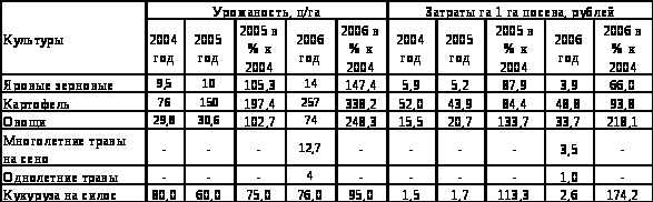 Урожайность зерновых культур с 2004 по2006 год стабильно растёт, а затраты на 1 га посевов снижаются. Сходная тенденция наблюдается и по картофелю. Урожайность овощей в свою очередь возрастает параллельно затратам 1 га посевов в два раза. Кукуруз не значительно варьирует по урожайности, но затраты за исследуемый период понимаются на 74%
