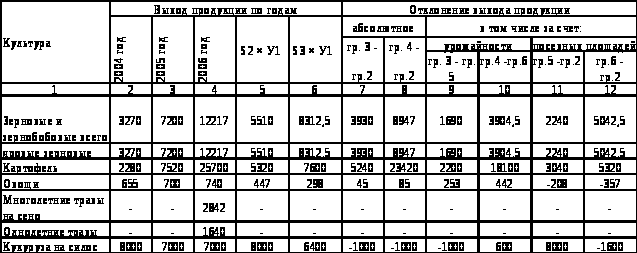 Производство продукции зависит от размеров и структуры посевных площадей и от урожайности культур. Отклонение выхода продукции в большую сторону наблюдается при увеличении площади посева или урожайности культуры, в меньшую сторону – при снижении урожайности, уменьшении площади.