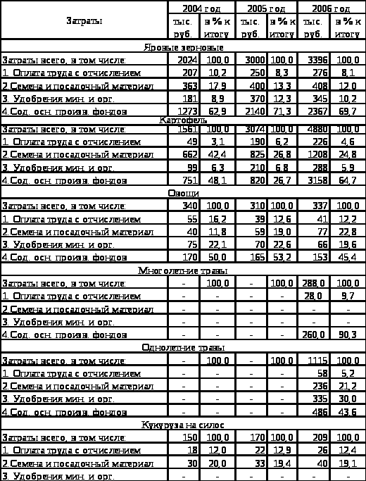 Затраты на производство продукции в период с 2004 по 2006 год увеличиваются, только по овощам наблюдается не значительное падение затрат. В структуре затрат первое место занимает содержание основных производственных фондов.