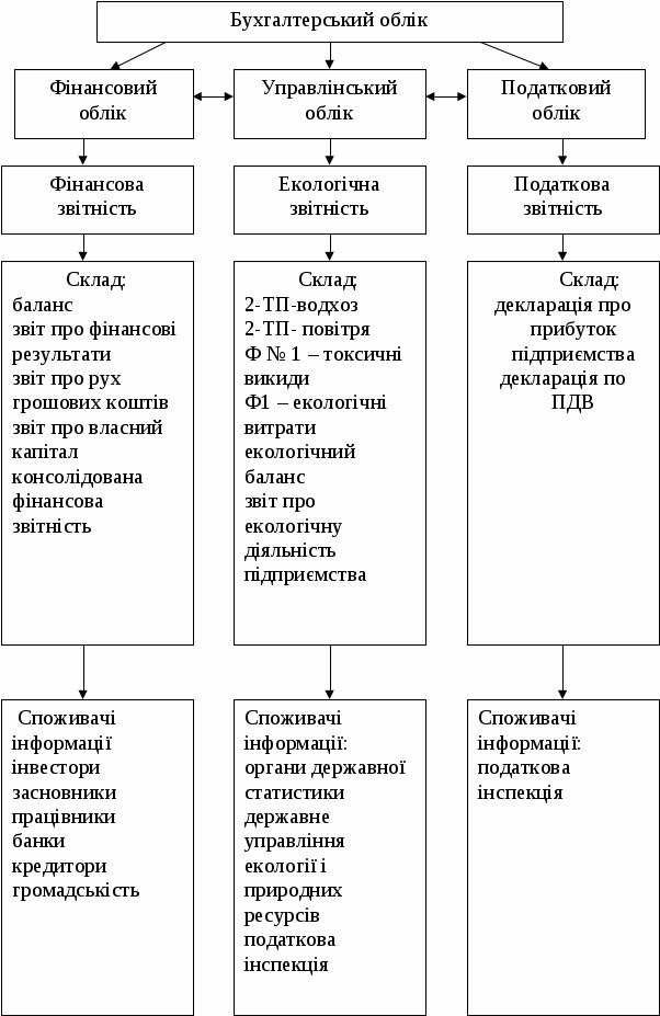 Система обліку в сучасних умовах повинна задовольняти щонайменше три групи користувачів: інвесторів, кредиторів, менеджерів і інших зацікавлених осіб (фінансовий облік); податкові органи (податковий облік); менеджерів всіх рівнів управління підприємством (управлінський облік).