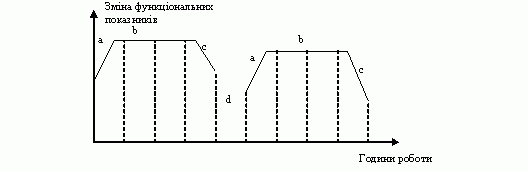 Як видно з мал.2.5.1, працездатність людини змінюється протягом робочого дня і може бути поділена на три фази. Тривалість першої фази (фаза впрацьовування (а) у залежності від виду праці коливається від декількох хвилин до 1 год. У завершенні цієї фази організм працівника переходить у так званий “стійкий стан” (b), що характеризується найвищою для даного індивіда ефективністю і стійкістю. Тривалість цієї фази залежить від інтенсивності праці, умов зовнішнього середовища і суб’єктивного відношення людини до своєї роботи.