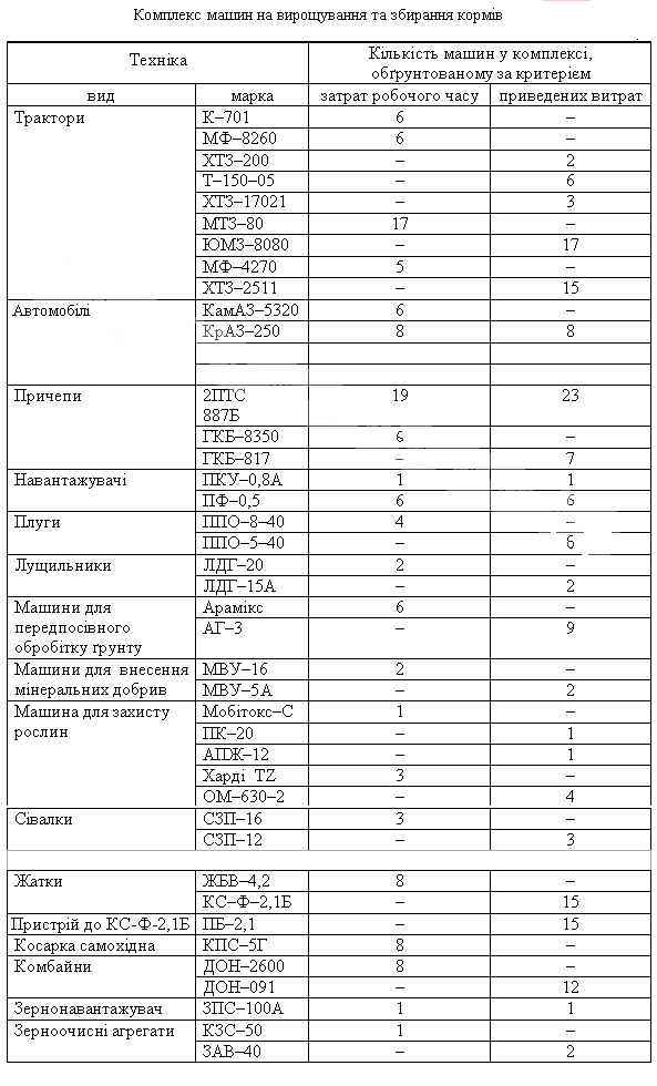 Важливою умовою одержання поживного корму є суворе дотримання технології його закладання в допустимі строки. Мінімально необхідна для цього кількість технічних засобів наведена в таблиці 13.20. У таблиці 13.21 наведено рекомендований склад комплексів машин для вирощування та збирання кукурудзи на зерно і силос на площі 1000га.