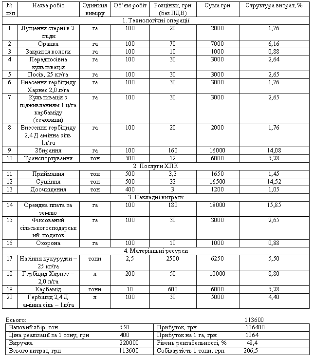 Технологічна карта і економічна ефективність вирощування кукурудзи