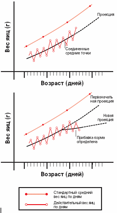 Ежедневный вес яйца является весьма чувствительным индикатором, (особенно перед выходом на пик продуктивности) показывающим насколько хорошо была накормлена птица. В случае, если отмечено снижение веса яйца ниже нормативных показателей, корм птице необходимо добавить. В стаде, получающем достаточное количество корма, вес яйца будет увеличиваться согласно целевым значениям. Если стадо недокармливается, то вес яйца будет оставаться неизменным на протяжении 4- 5 дней. В таком случае необходимо ускорить очередное прибавление корма. Если ожидаемый пик кормления уже достигнут, прибавление корма необходимо проводить в количестве 5 г на птицу в день. Прибавление корма при недостаточном весе яйца при продуктивности в 75% и выше не рекомендуется, поскольку на этом этапе уже существует большая вероятность ожирения птицы. Представленный ниже график демонстрирует, насколько важным может быть такой показатель как вес яйца для определения момента начала прибавления корма перед пиком продуктивности.