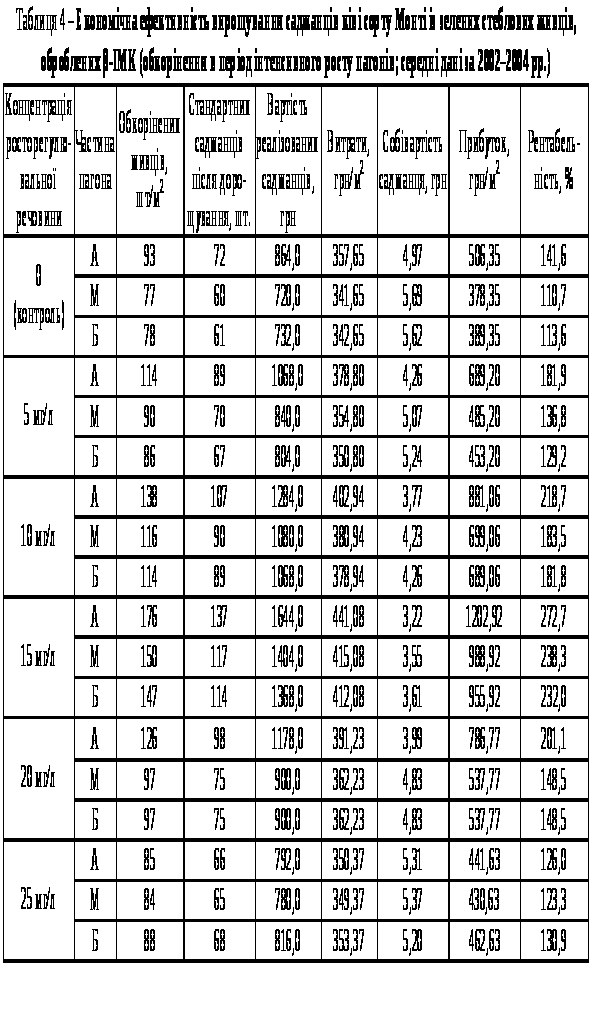 Завдяки збільшенню виходу стандартних саджанців, у порівнянні з контролем, їх собівартість у сильнорослих сортів Бруно і Монті зменшилася в 1,1…1,6 раза, Оріентал Деліхт – у 1,1…1,7 раза; прибуток збільшився, відповідно, на 92…620, 118...625 і 112…765 грн, а в оптимальному варіанті з обробкою апікальних живців цих сортів в-ІМК з концентрацією 15 мг/л зріс, відповідно, на 653, 697 і 755 грн і в оптимальному варіанті з обробкою 10% калійною сіллю б-НОК – на 674, 729 і 798 грн у порівнянні з обробкою водою, застосування в-ІМК і 10% калійної солі б-НОК збільшило рівень рентабельності для сорту Бруно на 116 і 121%, Монті на 126 і 139%, Оріентал Деліхт на 136 і 153% (табл. 4).