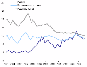 С 2001 года среднее соотношение цена/прибыль по российским акциям выросло почти втрое. Этот скачок выглядит ещё более впечатляющим, на фоне стагнации того же коэффициента по бумагам других развивающихся стран и его резкого снижения по акциям развитых рынков. В результате дисконт российских бумаг по текущему P/E почти исчез. Это ставит наш рынок в сильную зависимость от будущих темпов роста прибылей эмитентов и динамики мировых фондовых площадок.