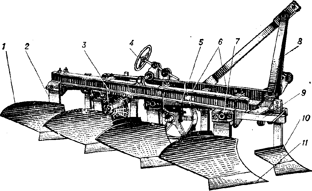 Рис. 1. Начіпний чотирикорпусний плуг: 1 - полиця; 2 - стояк корпуса; 3 - дисковий ніж; 4 - регулятор глибини; 5 - опорне колесо; 6 - балка жорсткості; 7 - сполучена вісь; 8 - сполучний стояк; 9 - рама; 10 - передплужник; 11 - леміш. |
