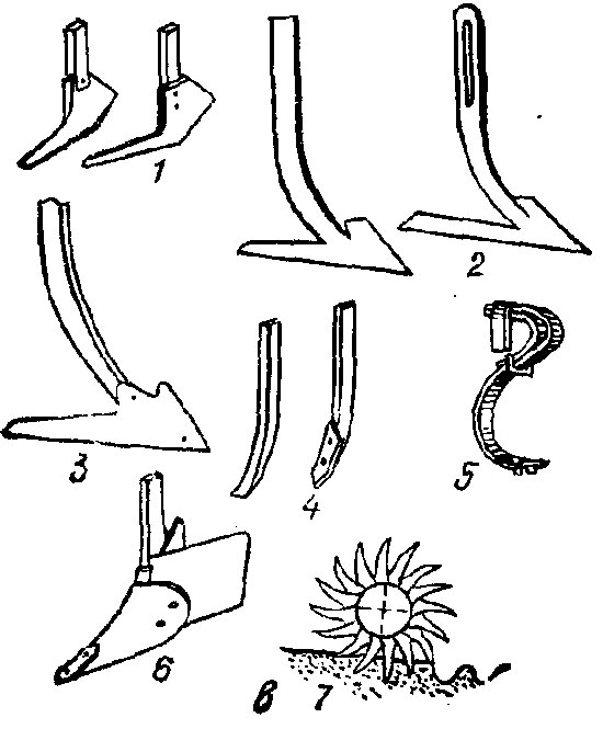 Рис. 3. Типи культиваторних лап: 1 - однобічні плоскорізальні; 2 - стрілчасті плоскорізальні: 3 - стрілчасті універсальні: 4 - розпушувальні долотоподібні, 5 - розпушувальні на пружинній стойці; 6 - підгортач; 7—голчасті диски, |