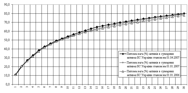 Таблица Б.1 Активи та зобов”язання перших 30 банківських установУкраїни станом на 01.01.2006 року [37]