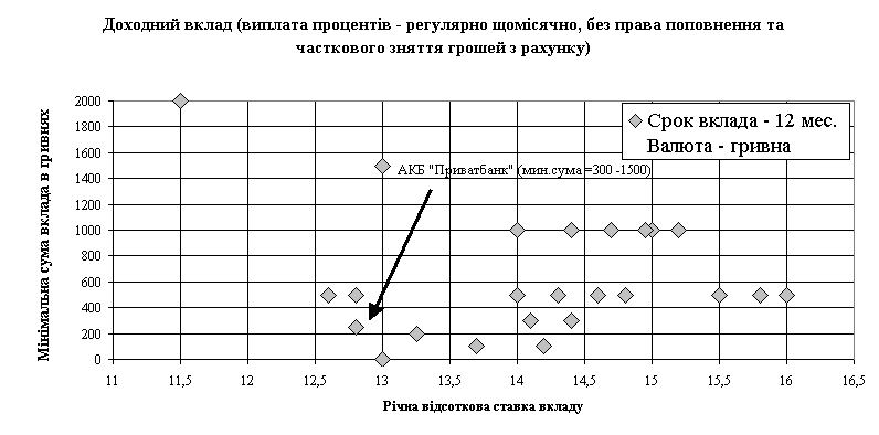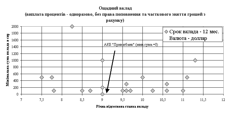 Рис.Г.2. – Конкурентне позиціонування пропозицій АКБ “Приватбанк” в сегменті ощадних строкових депозитів фізичних осіб в гривнях (обмеження мінімальної суми депозиту в залежності від % ставка депозиту)