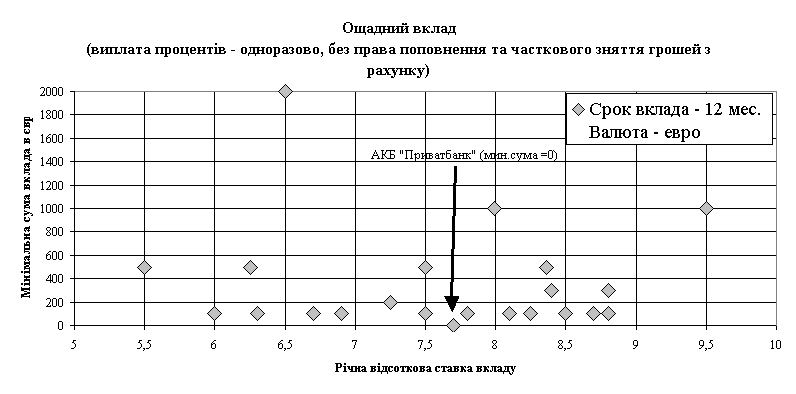 Рис.Г.12. – Конкурентне позиціонування пропозицій АКБ “Приватбанк” в сегменті доходних строкових депозитів фізичних осіб євро (обмеження мінімальної суми депозиту в залежності від % ставка депозиту)