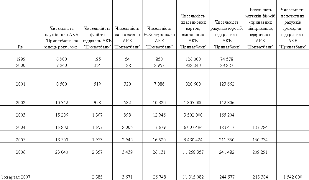 Інформаційною базою дипломного дослідження були – звітні документи АКБ “Приватбанк” за 2000 – 2007 роки, статистичні матеріали Національного банку України, Асоціації українських банків, Держкомстату України.
