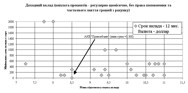 Рис.Г.10. – Конкурентне позиціонування пропозицій АКБ “Приватбанк” в сегменті доходних строкових депозитів фізичних осіб в доларах США (обмеження мінімальної суми депозиту в залежності від % ставки депозиту)