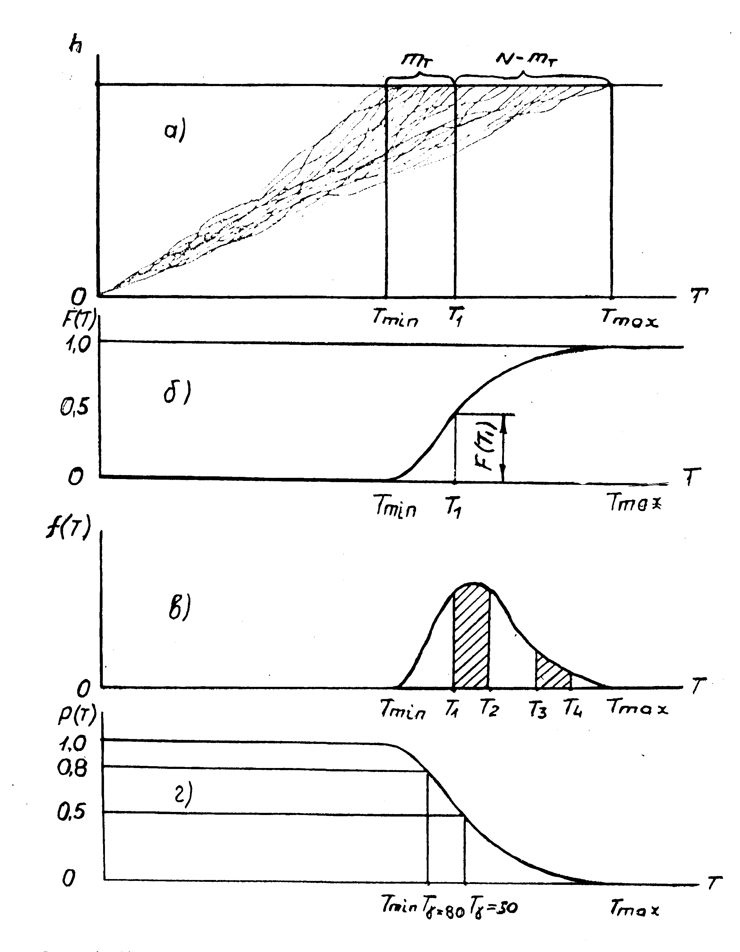 Для кожного об’єкта залежність зносу його елементів від експлуатаційного напрацювання Т представляє собою випадкову функцію. Отримати відомості про ресурс конкретного об’єкта до проведення його випробувань практично неможливо. Результати завершених експлуатаційних випробувань партії однотипних об’єктів дозволяють знайти закон розподілення ресурсу об’єкта і побудувати графік, який показує ймовірність того, що на протязі заданого напрацювання Т виникає потреба в капітальному ремонті об’єкта (рис. 1, б). З цього графіка видно, яка частина усіх випробуваних об’єктів потребує капітального ремонту чи заміни при відповідному напрацюванні Т. Ординату будь-якої точки графіка F(T) знаходять як відношення кількості об’єктів m, які втратили ресурс при досягненні напрацювання Т, до загальної кількості об’єктів n, які приймають участь у випробуванні, тобто: