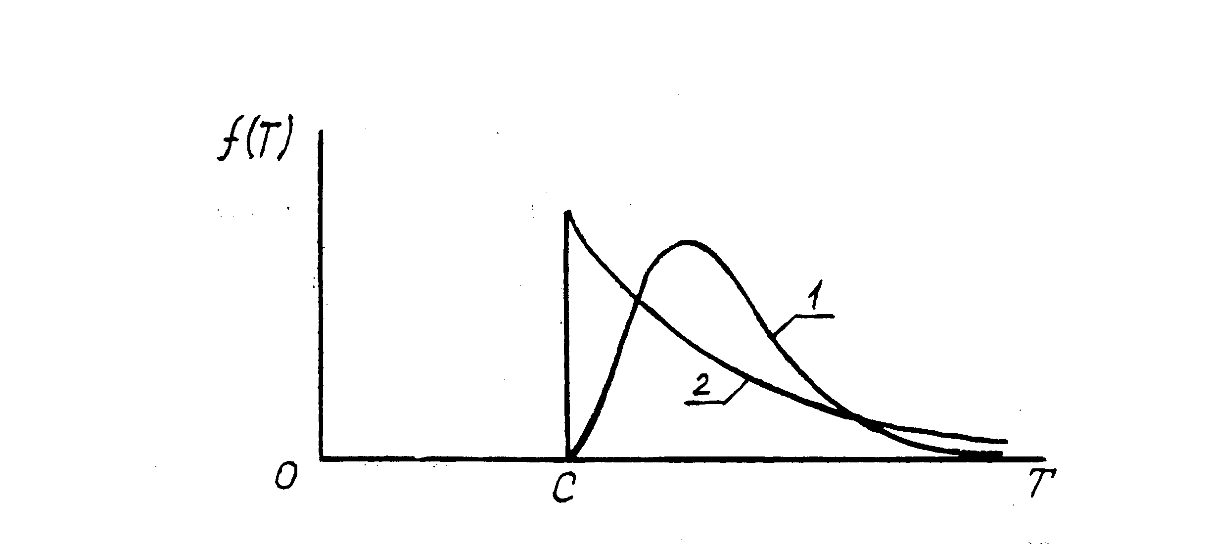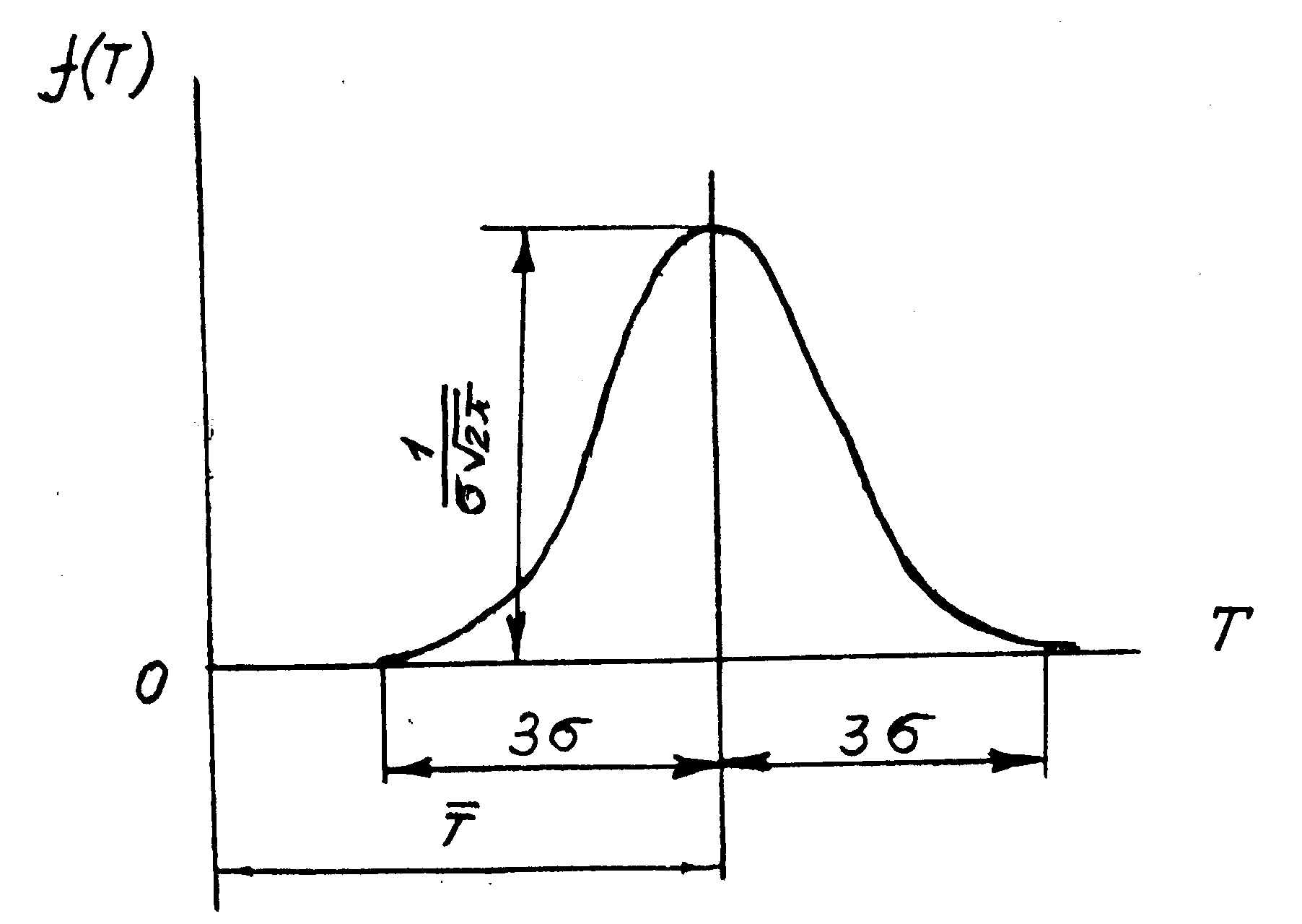 Графік функції f(T) показаний на рис. 2. Як видно з графіка, найбільше значення функція буде мати при середньому значенні напрацювання. Чим більше значення випадкової величини напрацювання відрізняються від середнього, тим менша щільність ймовірності відповідає таким значенням.