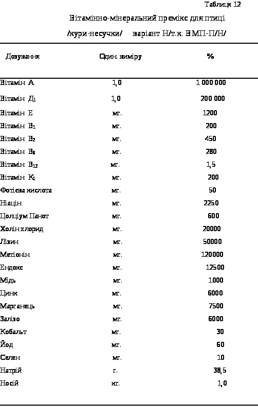 Дослідження В. І . Георгівського /1979/, Л. Е. Ботка /1975 /, Г. О. Богданова /1990/ довели,що потреба птиці у вітамінах та мінеральних речовинах є незначною,але обов’язково повинна бути збалансована і забезпечена у певному співвідношенні . Відсутність або нестача їх викликає у птиці розлади обміну речовин, що знижує інтенсивність росту та продуктивність курей .