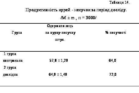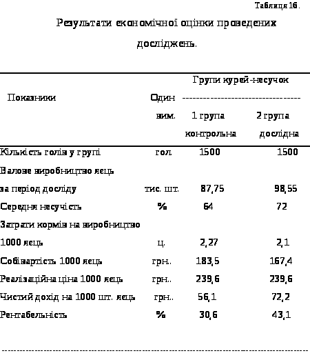 На основі проведеного аналізу було встановлено: що дослідні кури-несучки показали вищі результати продуктивності. Так за період досліду отримано 65,7 штук яєць, а валове виробництво яєць становило 197,1 тис. шт., тоді як у контрольних курей-несучок на одну курку одержано 58,5 штук яєць, а валове виробництво яєць відповідно 175,5 тис. шт., що дало можливість при майже однакових затратах кормів на виробництво 1000 яєць отримати чистий дохід на 16,1 грн. Більше у порівнянні із першою контрольною групою курей-несучок.