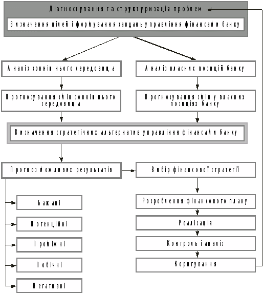Розробка обґрунтованого плану діяльності банку базується на результатах докладного аналізу фактичного становища банку та прогнозування майбутніх форм діяльності. Аналіз з позицій сьогодення та майбутнього стосується таких основних сфер управління банківською діяльністю: