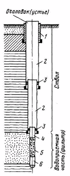1 - кондуктор; 2 - обсадные трубы; 3 - сальники; 4 - надфильтровая труба; 5 - фильтрующая часть; 6 - отстойник фильтра.