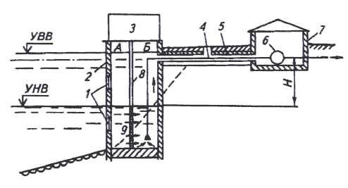 1 - входные окна; 2 - береговой колодец; 3 - служебный павильон; 4 - всасывающие трубы; 5 - галерея; 6 - насосы; 7 - насосная станция первого подъема; 8 - перегородка берегового колодца; 9 - сетка; А - приемное отделение; Б - всасывающее отделение.