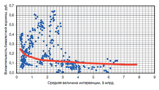 Как показывает опыт Мексики, Турции и Чили интервенции не всегда являются эффективным инструментом воздействия на валютный курс или уменьшения его волатильности. Как констатируют многие исследователи, интервенции на практике часто ведут лишь к увеличению волатильности валютного курса. Однако центральные банки официально отвергают этот вывод, заботясь об обосновании вмешательства на валютном рынке. Кроме того, МВФ требует, чтобы политика интервенций сглаживала, а не увеличивала амплитуду колебаний обменного курса [19].