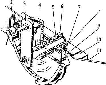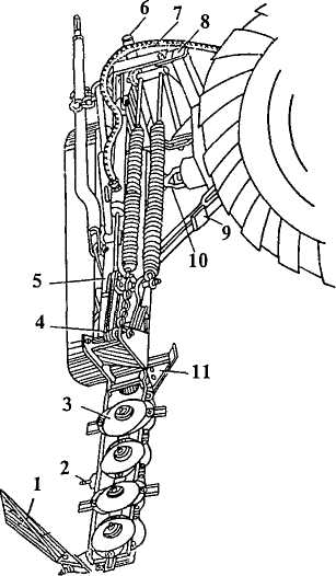 1 — полевой делитель; 2 — кронштейн; 3 — режущий аппарат; 4 — механизм уравновешивания; 5 — подрамник; 6 — стойка; 7 — гидрооборудование; 8 — рама навески; 9 — тяговый предохранитель; 10 - механизм привода; 11 — носок.