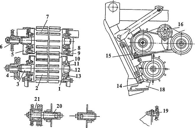 При работе косилки в «расстил» с нее снимают боковины валкообразующего устройства. Вальцы плющильные включают в себя верхний 7 (рис. 2) и нижний 2 вальцы, блок привода 21, натяжное устройство 19, цепи и механизм регулирования давления между вальцами. Нижний валец 2 прикреплен к боковинам рамы. Между фланцами 1 и 13 установлены сферические корпуса 10 с подшипниками 11, в которых размещены левая 3 и правая 12 цапфы вальца. Левая цапфа оснащена двухрядной звездочкой 4. Верхний валец при помощи кронштейнов 5 и 18 шарнирно сочленен с боковинами рамы, левая цапфа 6 оснащена звездочкой передачи вращения, а к кронштейну присоединена звездочка 16 натяжного устройства.