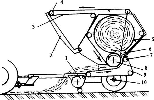1 - подборщик; 2 - рычаг; 3 - ремень прессующий; 4 - валик;5 - задняя стенка; 6 — валик; 7 - плавающий валик; 8 — барабан;9 — питающий транспортер; 10 — опорное колесо.