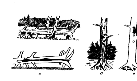 Рис.1. Убежища соболя: а – выводковое гнездо в старой валежине, б – то же в дупле лиственнице, в – зимнее гнездо под корнями дерева.